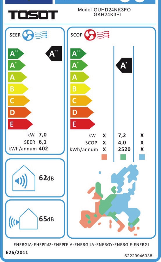 | S.E.E.R. Waarde koelen / Energieklasse | W/W | 5,9 / A+ | 5,9 / A+ | 7,2 / A++ | – |